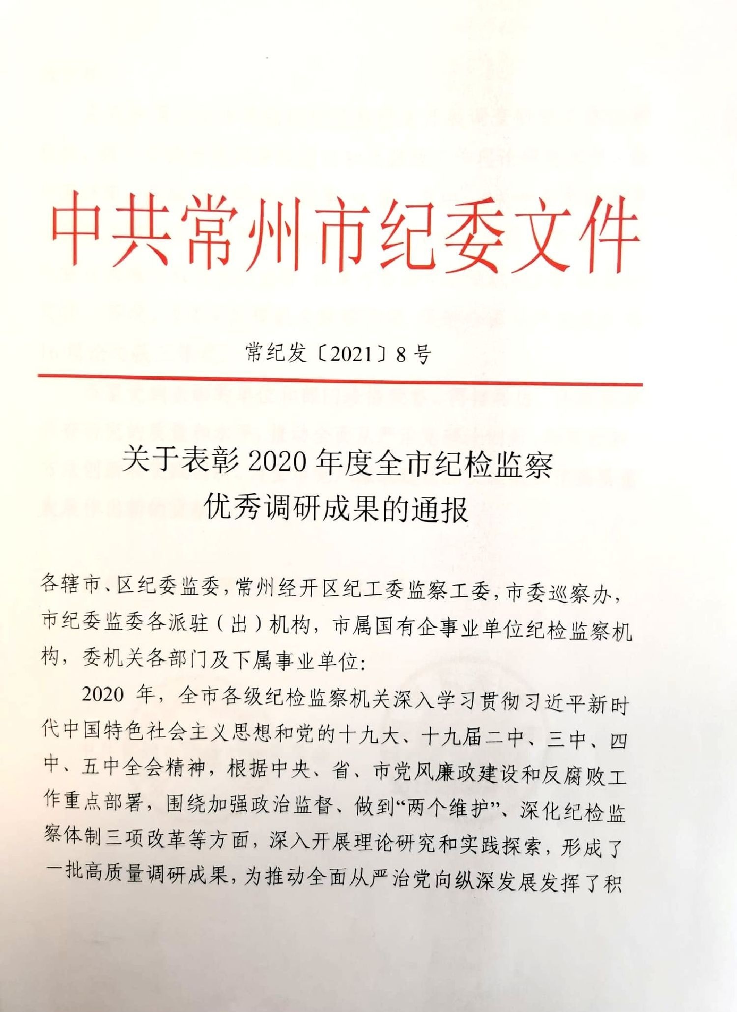 近日,常州市纪委监委通报表彰2020年度全市纪检监察优秀调研成果,我校纪委办公室何松老师撰写的调研报告《派驻机构与地方纪委监委协作机制的研究》荣获二等奖。